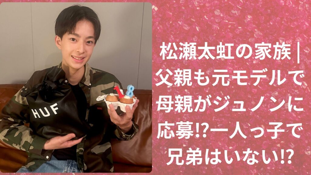 松瀬太虹さんは、「第34回ジュノンコンテスト」で審査員特別賞を受賞し、芸能界デビュー。現在はボーイズグループ「The Right Light」のメンバーであり、nicolaの専属メンズモデルや俳優業などでも大活躍されています。 この記事では、太虹さんの父親・母... -