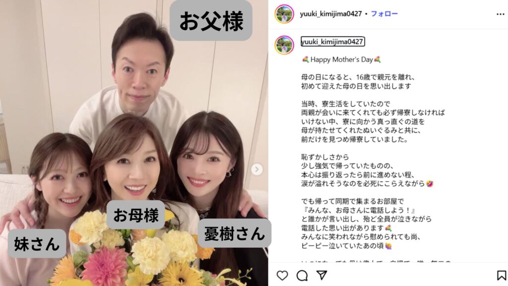 憂樹さんの父親・母親・妹のエピソードを紹介します。